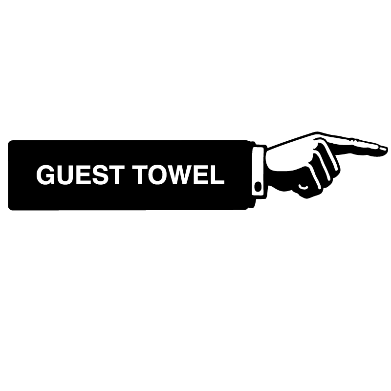 Jag gjorde en skylt som löste problemet för mig och dig. Det blev en en hand som pekar på just vilken handduk som är till för gäster. Den finns på svenska och engelska. Skylten är en sticker som passar att sätta på kakel. En enkel, dekorativ och praktisk kakeldekor.